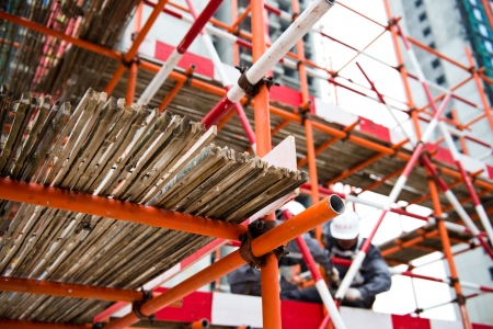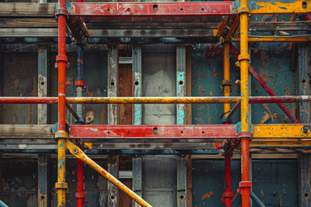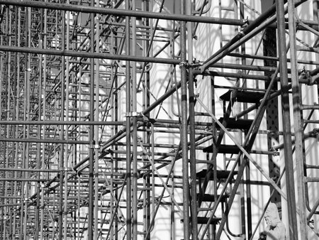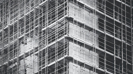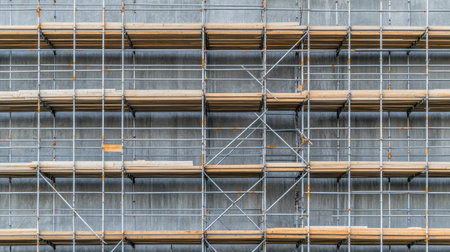 A detailed view of scaffolding at a construction site highlights the architectural framework and urban development, underlining the ongoing building progress.