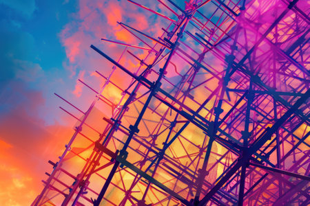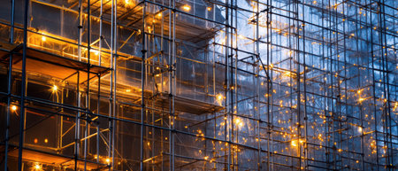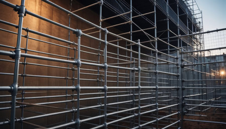 The geometric patterns of metal scaffolding against a building in the early evening reflect the intricate details of construction.. AI Generation