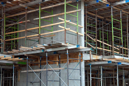 Concrete formwork and scaffolding on a construction site. Horizontally framed shot.