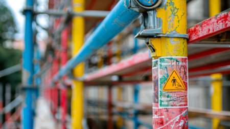A series of colorful stickers are p on the edges of all scaffolding indicating weight limits and other important safety guidelines