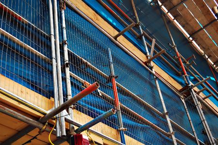 A close-up view of a construction site showing metal scaffolding and framework on a building facade. The image captures the essence of urban renovation work with detailed construction elements.