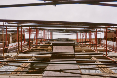 Scaffolding with wooden decks, bottom view. Performing construction work at height. Construction safety
