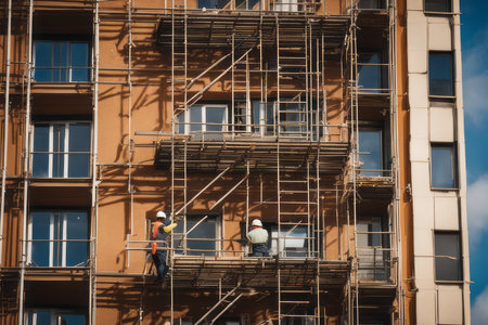 Intricate scaffolding encases a building under renovation in an urban setting, capturing the essence of construction.. AI Generation. AI Generation