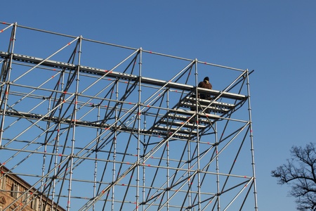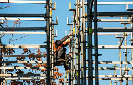 Dnepropetrovsk, Ukraine - 10.26.2021: A worker checks the build quality of the scaffolding.