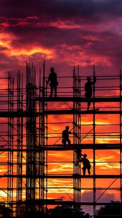 Silhouettes of construction workers on scaffolding against a stunning sunset sky, showcasing hard work and teamwork in construction.