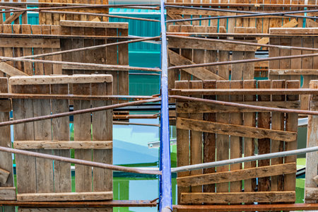 A close-up view of industrial scaffolding with metal frames and wooden planks in a construction zone, emphasizing safety and building processes within an urban area.