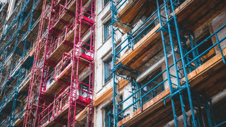 A vibrant display of scaffolding in blue and red surrounds a building undergoing renovation, showcasing urban construction dynamics and safety measures in place.
