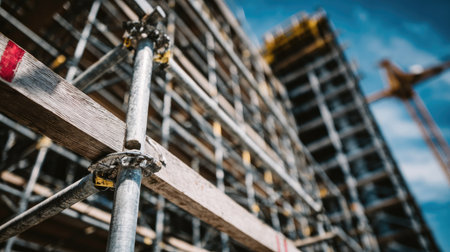 This image captures a detailed view of scaffolding at a construction site. The strong structure showcases metal and wood elements under a clear blue sky, hinting at industry progress.