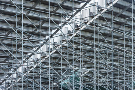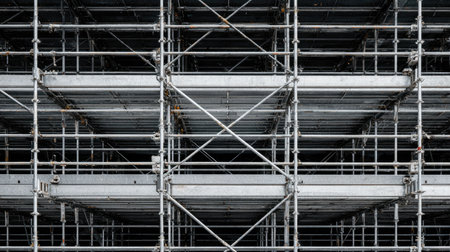 This image features a close-up view of industrial scaffolding, showcasing the intricate arrangement of metal beams and supports used in construction sites for safety and support.