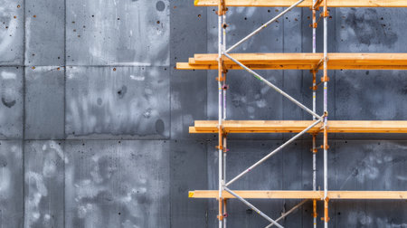 This image showcases an industrial scaffolding system made of wood and metal against a textured concrete wall, ideal for construction and renovation applications.