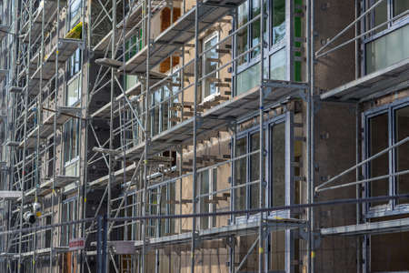 Extensive scaffolding providing platforms for work in progress on a new apartment block, Tall building under construction with scaffolds, Construction Site of New Building