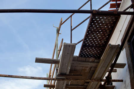 Scaffolding with wooden decks, bottom view. Performing construction work at height. Construction safety