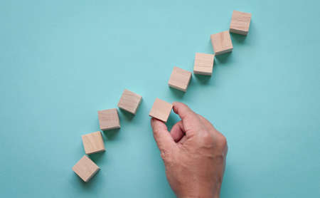Hand is building stair steps from blank wooden cubes, business growth and management success concept, blue background with copy space, selected focus