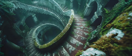 A captivating view of a winding staircase, revealing a blend of cool tones and warm light. This atmospheric shot highlights the spiral design and textures, creating a sense of depth and mystery, perfect for architectural themes.