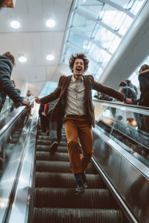 a joyful young man in an unbuttoned suit runs cheerfully down the steps of the escalator