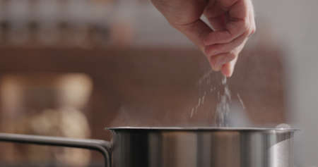 man hand salting bopiling water for pasta in saucepan closeup