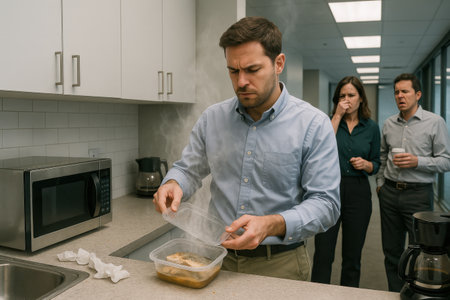 Coworker Heating Fish in Office Kitchen, Colleagues React. AI Generative.