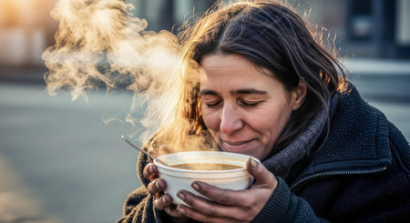Woman enjoying hot soup outdoors, surrounded by steam and warm sunlight in a chilly environment