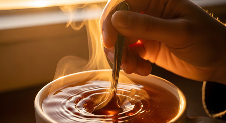 A close-up shot of a hand stirring amber-colored tea in a white cup with a silver spoon. The liquid swirls dynamically, backlit by warm sunlight that highlights the steam and the rich color of the beverage.