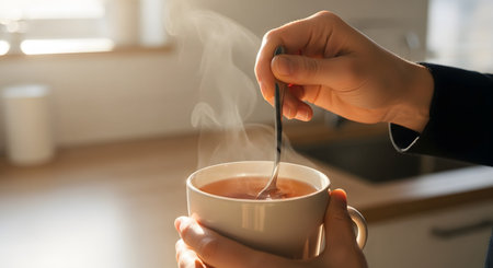 Close-up of hands holding a white cup and using a spoon to stir a hot, amber-colored beverage, likely tea. Steam rises from the cup, backlit by warm sunlight, creating a cozy and relaxing morning atmosphere.