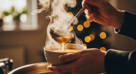 A person is ladling hot soup into a bowl. Steam rises from the soup. The background features blurred Christmas lights creating a festive atmosphere.
