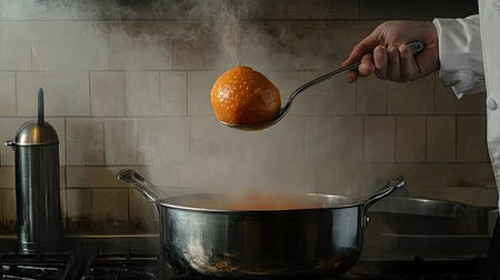 A chef lifts a vibrant glazed orange from a steaming pot using a silver spoon, capturing the artistry and enthusiasm of culinary preparation in a professional kitchen.