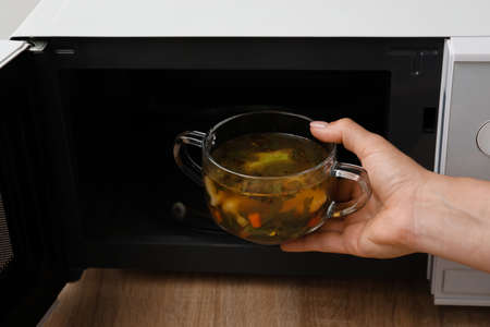 Woman putting bowl with delicious soup into microwave oven on wooden table
