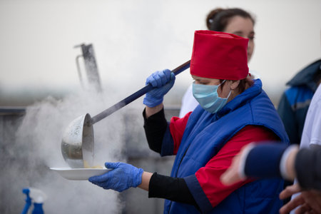 November 13, 2020. Belarus, Gomil region. PA Cooking street food during the coronavirus panademy. A chef in a medical mask with a large scoop pours soup.
