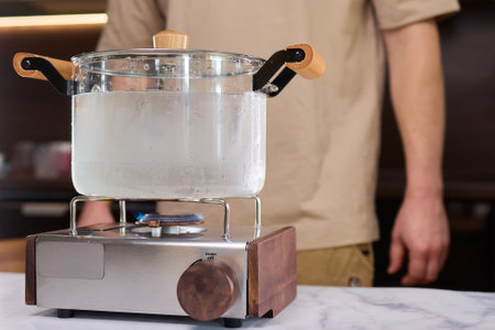 A detailed shot of a glass pot with clear water boiling, capturing the steam and bubbles, with the kitchen stove and surrounding utensils slightly blurred.