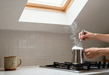 Person whisking steaming milk in metal pot on stovetop beneath skylight in modern kitchen, cracked mug on counter nearby.