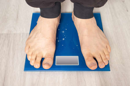 Man weighing himself - male bare feet stepping on white digital floor scales at home: close up view. Measuring weight, control, wellness and diet concept.