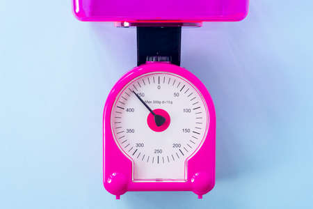 Top view of purple plastic scales placed in the center on a light blue background with copy space on right and left.