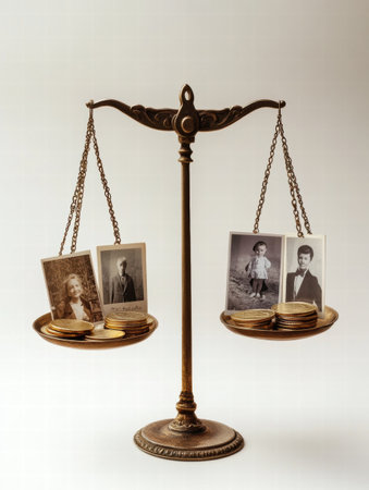 Scales display two sides of historical photographs, capturing childhood moments and evoking feelings of nostalgia in a minimalist setup.