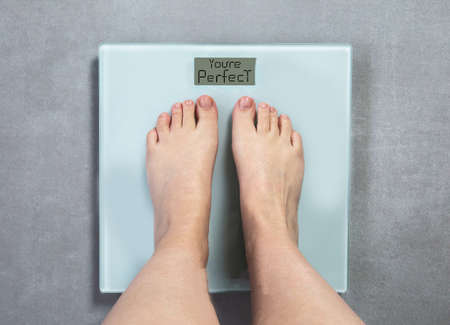Human Feet on digital weight scale with the words Youre Perfect, self confidence and diet concept top view pn gray floor background