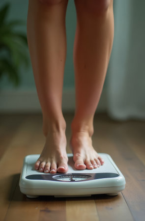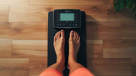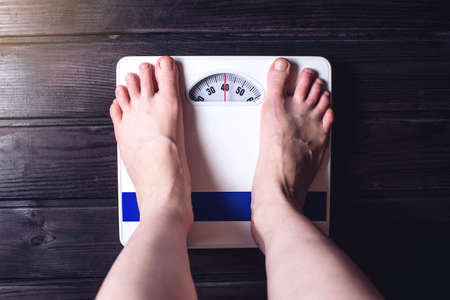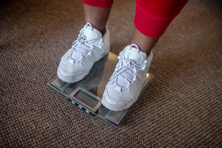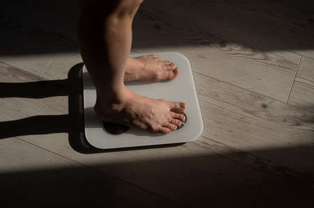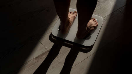 Close-up of woman standing on bathroom scale. Weight loss concept