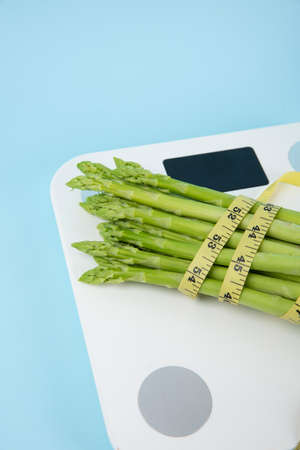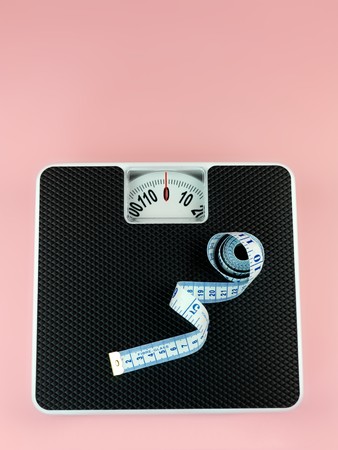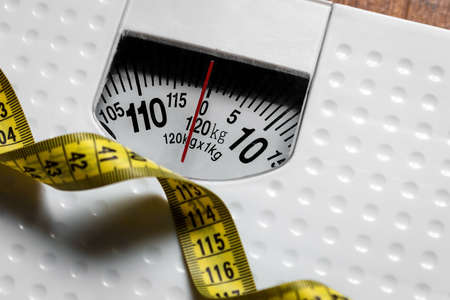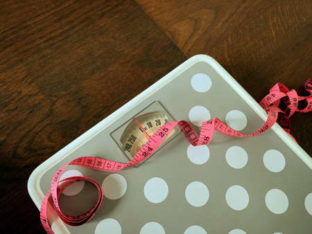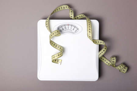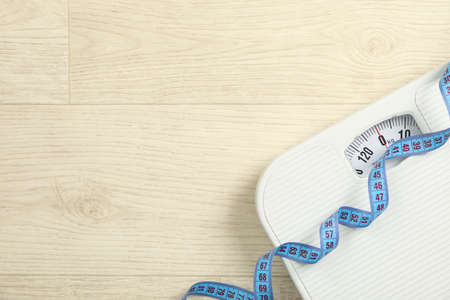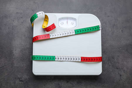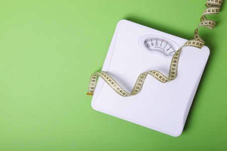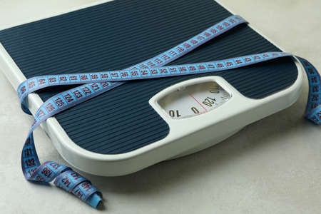 Weight scale and measuring soft tape close up image. Weight loss concept