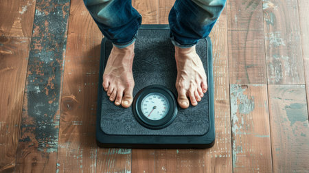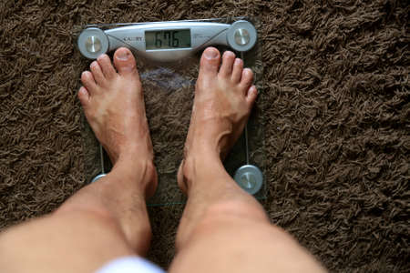 Close-up of man%27s feet on weight scale. Weight loss concept