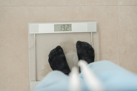Those digits are finally decreasing. Closeup shot of a young woman weighing herself on a scale at home.