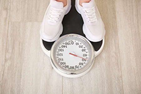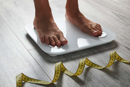 Closeup of woman's feet on weight scale. Healthy lifestyle concept