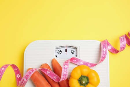 The concept of losing weight. Scales with measuring tape on yellow background. Healthy eating. Top view