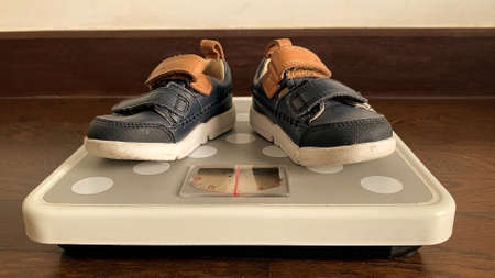 Image of toddler shoe on top of a weight scale. Weight loss concept