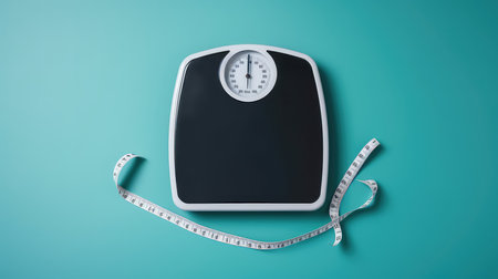 Weight scale with measuring tape on turquoise background. Weight loss concept