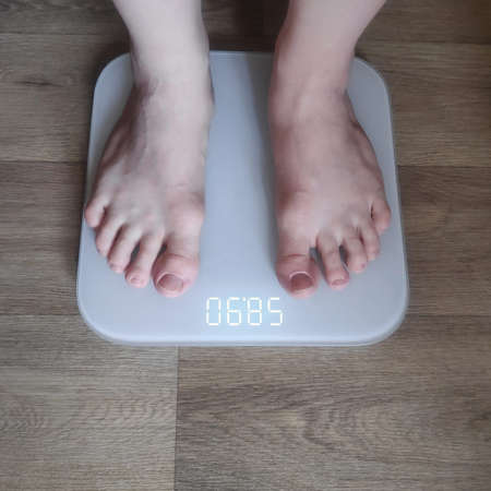 Woman stands on white modern electronic scales, which show 64.5 kg. Only feet are visible. Scales stand on gray wooden floor. Copy space. Healthy lifestyle, diet, weight loss concept. Top view.