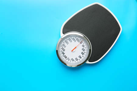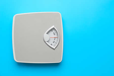 Floor scales and centimeter measuring tape on a blue background, top view. The concept of weight loss and weight control
