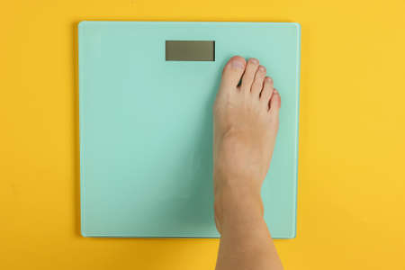 Woman stands barefoot on a floor scale. The concept of losing weight. Studio shot on yellow background. Top view