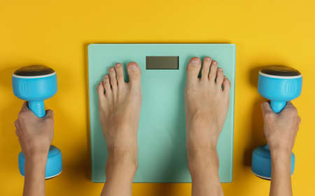 Woman with bare feet holds dumbbells in her hands and measures her weight on scale against yellow background. Sport and fitness concept. Top view