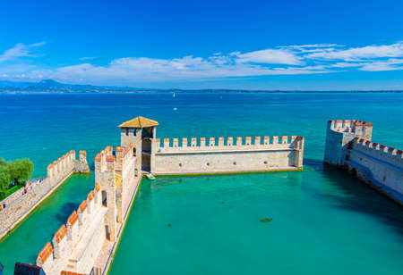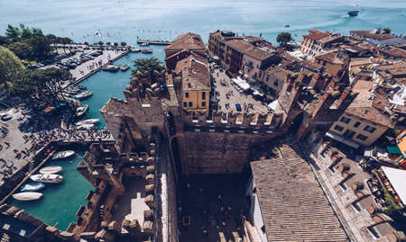 Italy, Lombardy - August 05 2018: aerial view of the Scaliger Castle reconstruction with horizon line on background on August 05 2018 in Sirmione, Italy.