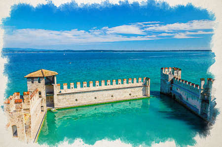 Watercolor drawing of Sirmione Small fortified harbor with turquoise water, Scaligero Castle Castello fortress, town on Garda lake, medieval castle with stone towers and brick walls, Lombardy