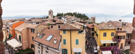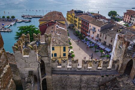 SIRMIONE, ITALY - MAY 24, 2019: View at town Sirmione from Scaligero Castle in Italy. Castle is a fortress from the Scaliger era built in 13th century.