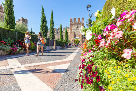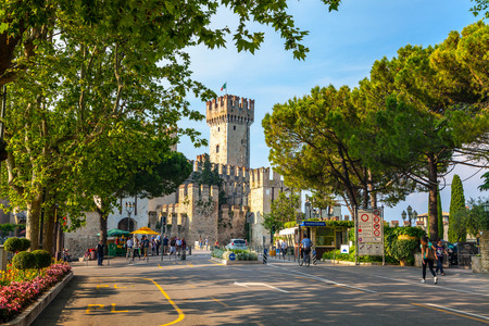 Sirmione, Italy, September 11, 2019: Scaligero Castle Castello fortress from Scaliger era, historical center of Sirmione town on Garda lake, medieval castle with stone towers brick walls, Lombardy
